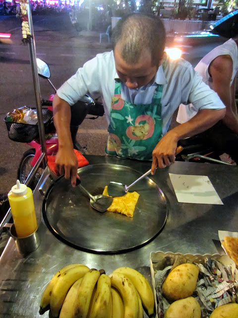 媽呀!好吃到我都想定居泰國了!!餅皮煎得酥酥的,但咬起來又有點QQ的口感,香蕉加熱後,呈現半融化的狀態,口感變得非常滑順。淋在上面的煉乳,甜甜的,配合著帶點微酸的香蕉,簡直就是犯規阿阿阿!一口又一口的,三兩下就吃完了,所以我們就買了第二個香蕉煎餅。(沒有大誤)