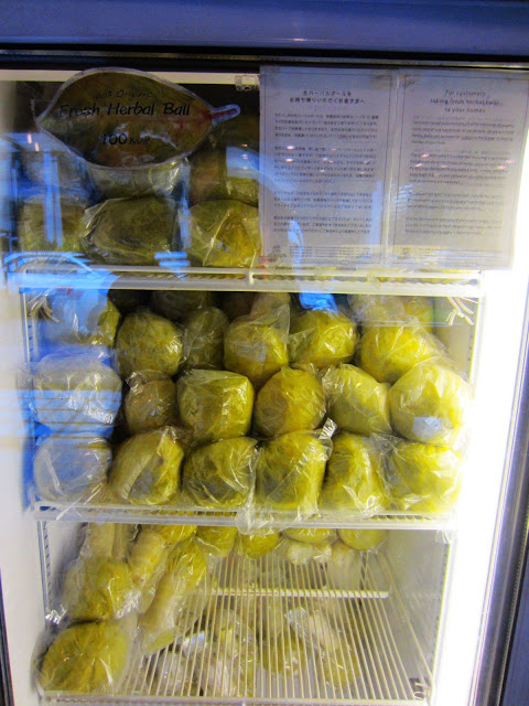 按摩結束後,服務人員又會再度到房門外等客人淋浴換裝,之後再領著我們回到大廳,大廳旁擺著許多周邊商品,這個冰箱裡是新鮮的藥草球,但因為保存期限有限而且需要冷藏,只能揮淚割捨。