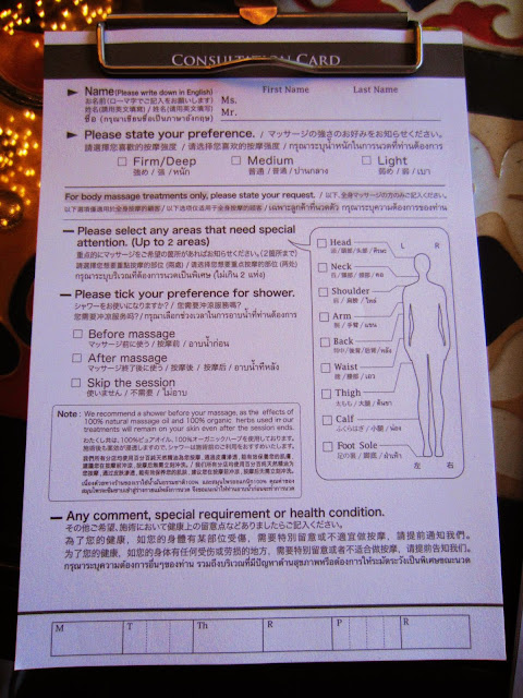 選好後服務人員會再給你一張表,上面有中英日文,完全沒有語言隔閡的問題。我覺得這張表好貼心 :)提供客製化服務,讓客人選擇按摩強度、想要加強的部位以及是否需要沖涼服務等。
